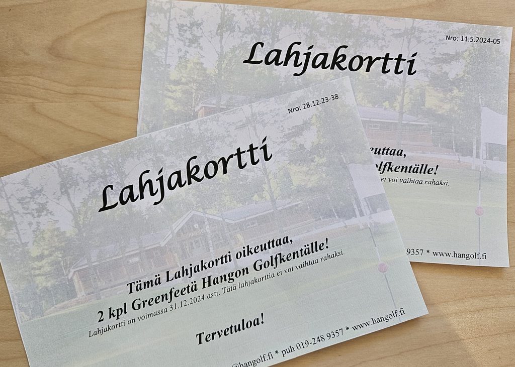 Lahjakortti on mieluisa ja helppo lahja golfarille. Meiltä voi ostaa lahjakortteja kukkaroon sopiville summille. Esim